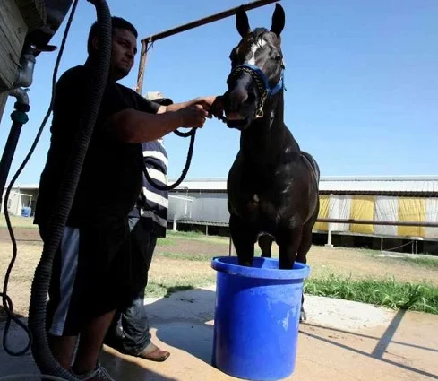 Cubeta de agua fría – Algunos caballos pueden poner sus patas en una cubeta con hielo. Además existen botas de goma para esta práctica; algunas de estas con “circulación” tipo spa.